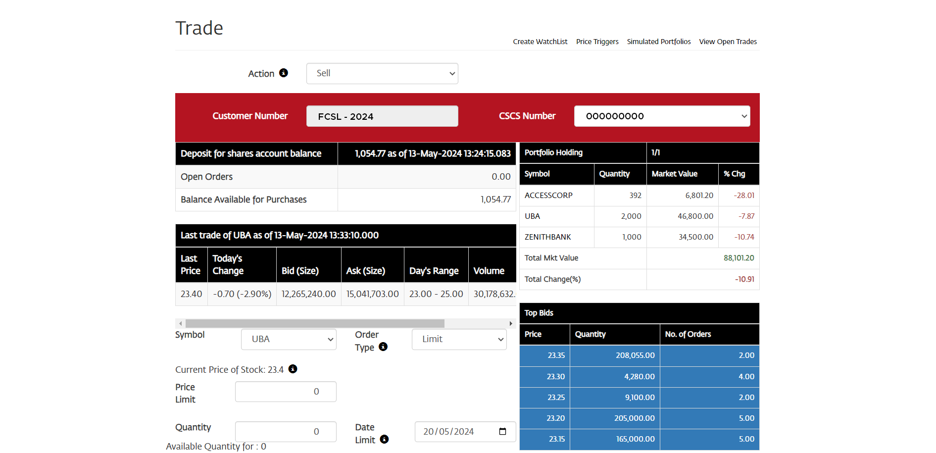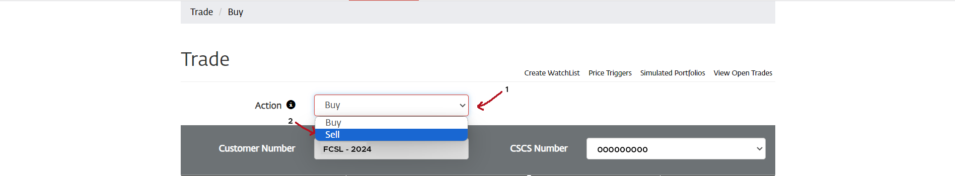 Upon selecting “Sell, ” click on the ‘Select Symbol’ drop-down button to choose the desired stock you want to sell; afterwards, the stock’s last trade summary is shown.