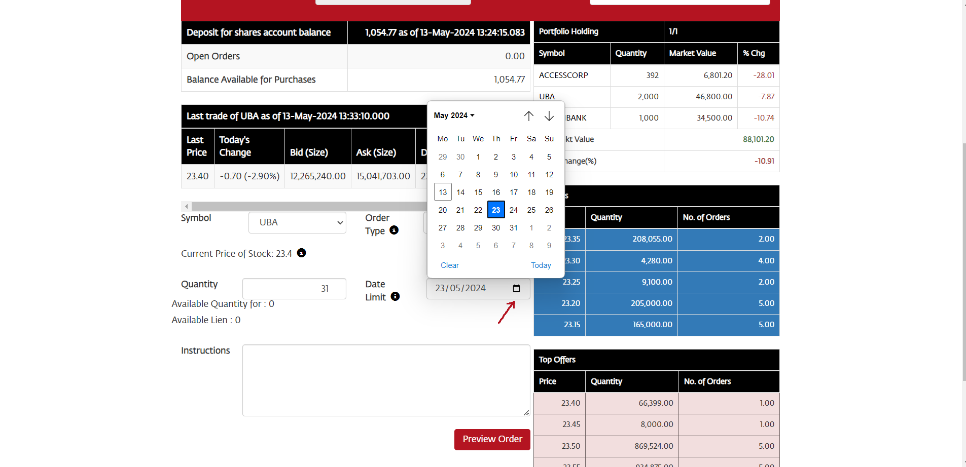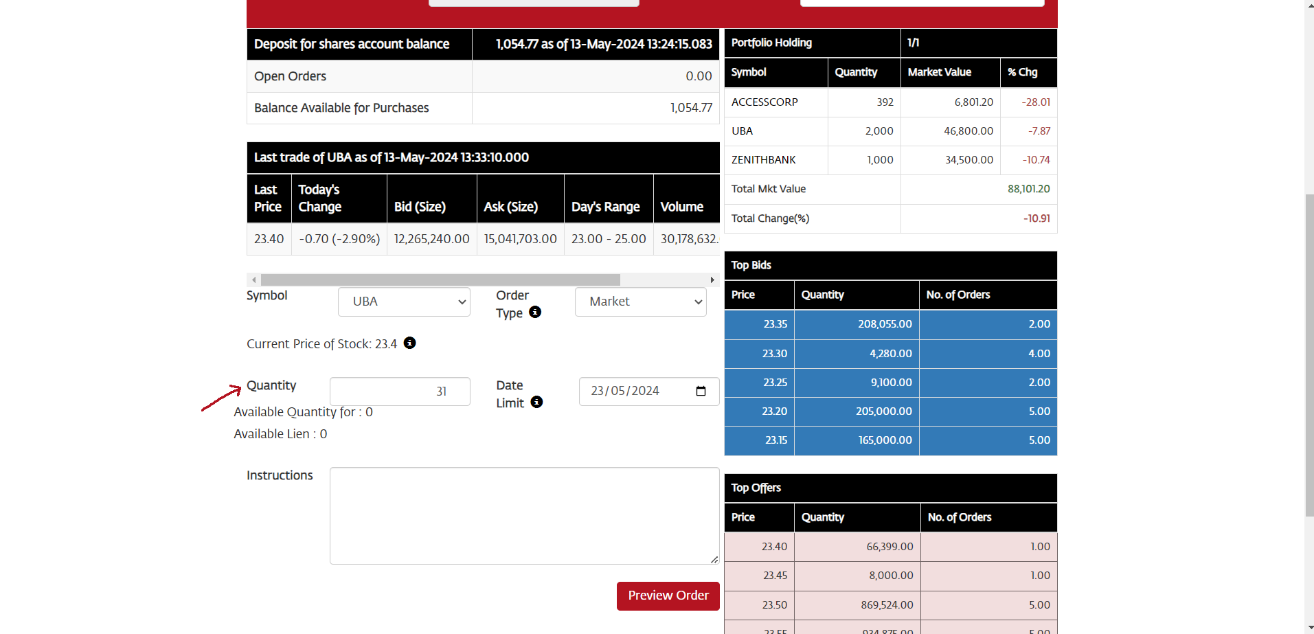 Input the quantity of the stock you want to sell, then proceed to click on the preview order.