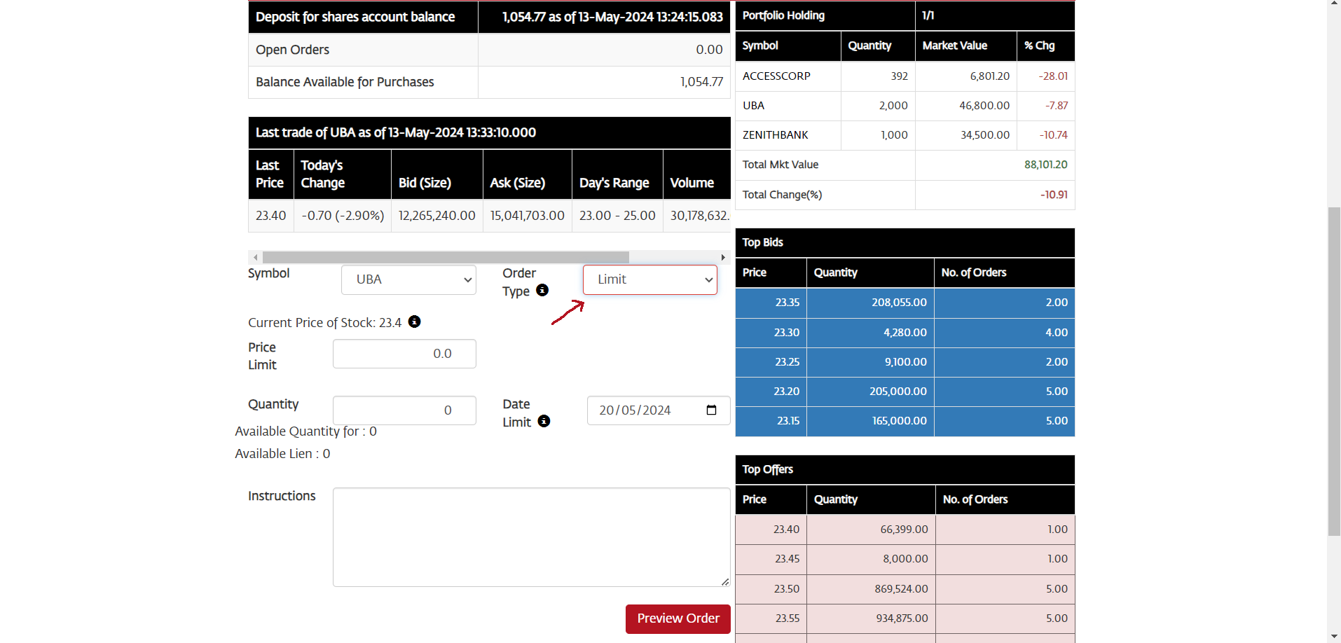 If you would want to sell the stock at the current price, please select ‘market’ as your order type otherwise, you will need to select ‘Limit’ to enable you to set your preferred price limit.