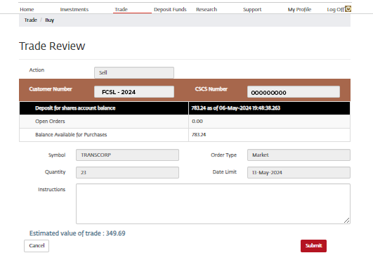 Upon clicking on the preview order, the trade review is displayed where you get to see your available balance and the estimated value of the trade.